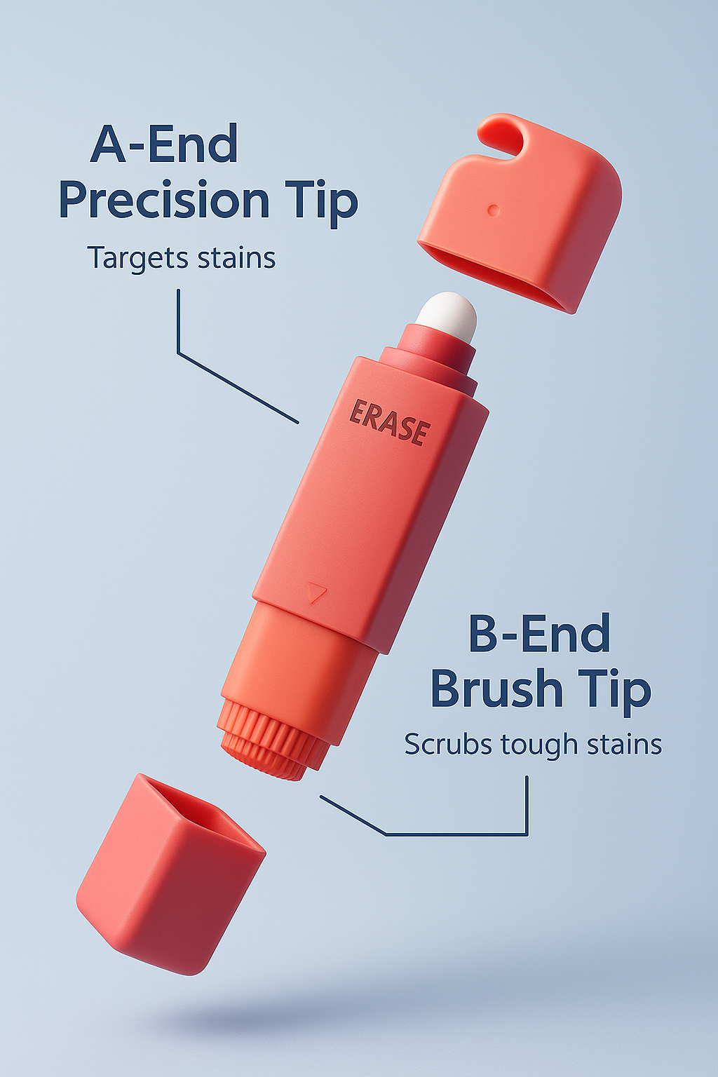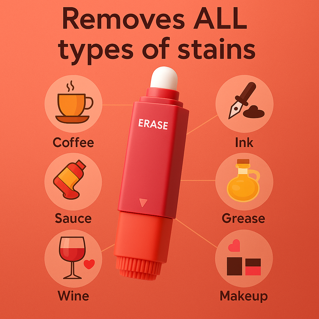 EraserBuddy™ is a portable, pen-shaped stain remover designed to erase fresh ink stains from clothes and fabrics instantly. Simply press the tip onto the stain, rub gently, and watch the ink disappear—no water or washing required.